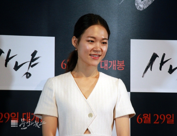 [문화뉴스] 영화 '사냥'의 언론/배급 시사회가 23일 오후 서울시 광진구에 있는 롯데시네마 건대입구에서 열렸다. 이날 기자간담회엔 이우철 감독, 배우 안성기, 조진웅, 한예리, 권율이 참석했다. 영화 '사냥'은 우연히 발견된 금을 독차지하기 위해 산에 오른 엽사들과 사냥꾼 '기성'(안성기)의 목숨을 건 16시간의 산속 추격을 그렸다. '최종병기 활'과 '끝까지 간다'의 제작진이 참여했다. 배우 한예리가 포토타임 포즈를 취하고 있다.