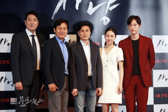 [문화뉴스] 영화 '사냥'의 언론/배급 시사회가 23일 오후 서울시 광진구에 있는 롯데시네마 건대입구에서 열렸다. 이날 기자간담회엔 (왼쪽부터) 조진웅, 안성기, 이우철 감독, 한예리, 권율이 참석했다. 영화 '사냥'은 우연히 발견된 금을 독차지하기 위해 산에 오른 엽사들과 사냥꾼 '기성'(안성기)의 목숨을 건 16시간의 산속 추격을 그렸다. '최종병기 활'과 '끝까지 간다'의 제작진이 참여했다.