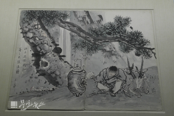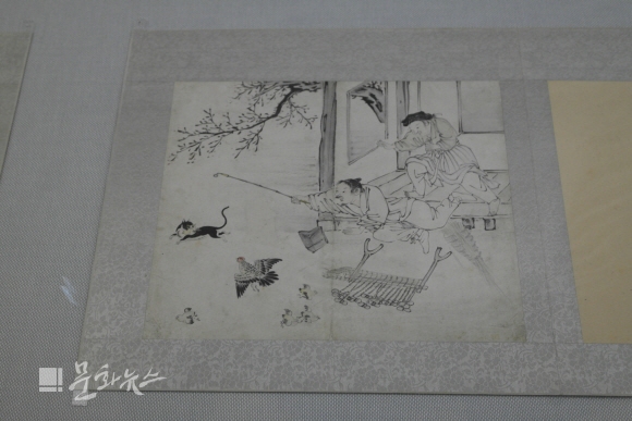 눈길을 끄는 작품은 김득신(金得臣)의 '야묘도추(野猫盜雛)다. 들고양이가 병아리를 훔쳐 달아나는 모습은 유연하고 능숙한 자연의 모습이다. 이를 쫓는 몰락 양반과 아내의 동작은 막 한순간을 포착한 것 같다. 그래서 영원한 것 같지 않지만, 그 상황 특유의 모습을 포착해서 영원히 우리의 뇌리에 남는다. 발을 짜던 기구들이 마당에서 뒹굴고, 사내는 거의 엎어지다 지기 시피해서 긴 담뱃대로 잡으려고 하지만, 들고양이를 쫓기에는 어림도 없다.