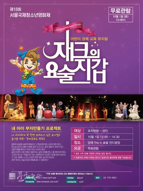 어린이 경제뮤지컬 '재크의 요술지갑'은 영화제 기간인 10월 1일 오후 1시에 더케이호텔 야외광장 메인무대에서 무료로 관람할 수 있다. 관람 신청은 서울국제청소년영화제 홈페이지 공지사항을 통해 온라인 접수로 가능하며, 2천 명의 관람객을 선착순으로 모집하고 있다.