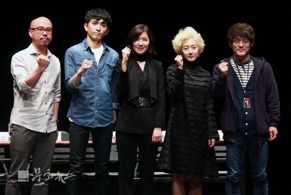 이번 공연의 주인공 '함익' 역엔 최나라가, '함익의 분신' 역은 이지연이 맡았고, 주인공인 '함익'의 고독한 내면을 흔드는 연극청년 '연우' 역엔 객원배우로 윤나무가 출연했다. (왼쪽부터) 김은성 작가, 배우 윤나무, 최나라, 이지연, 김광보 연출이 파이팅 포즈를 취하고 있다.