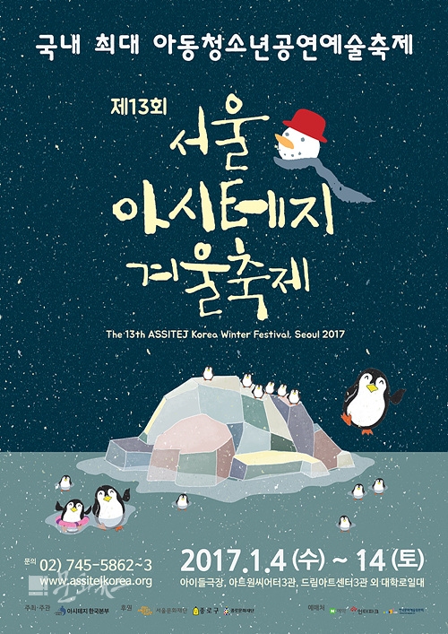 국제아동청소년연극협회 한국본부(이사장 김숙희, 이하 아시테지 한국본부)가 '제13회 서울 아시테지 겨울축제'를 2017년 1월 4일부터 14일까지 아이들극장, 아트원씨어터 3관, 드림아트센터 3관 등 대학로 일대에서 개최한다. 이번 축제에는 '제25회 서울어린이연극상' 본선진출작으로 구성된 '올해우수작' 6편과 '공식초청작' 6편이 무대에 오른다.