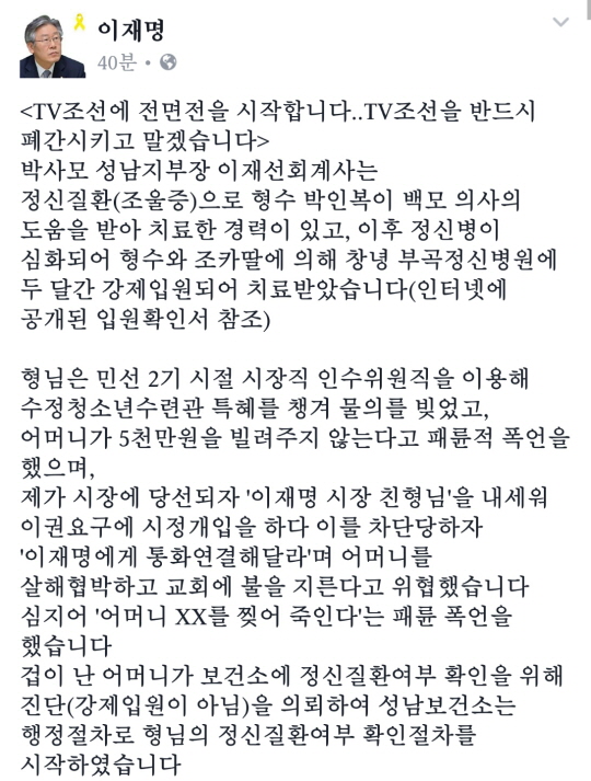 [문화뉴스] TV조선이 이재명 시장이 셋째 형을 정신병원에 강제 입원 시키려고 했다는 의혹을 단독 보도한 가운데 이재명 시장이 "TV조선을 반드시 폐간시키고 말겠다"고 밝혔다.