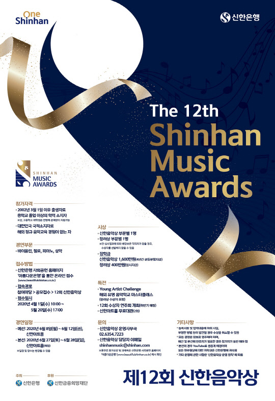 2009년 시작돼 올해로 12회째를 맞은 신한음악상은 2002년 3월 1일 이후 출생한 중학교 이상의 학력 소지자(고등학교 재학생은 연령 제한 없음)로 해외 정규 음악교육 경험이 없는 순수 국내파 청소년을 대상으로 한다.