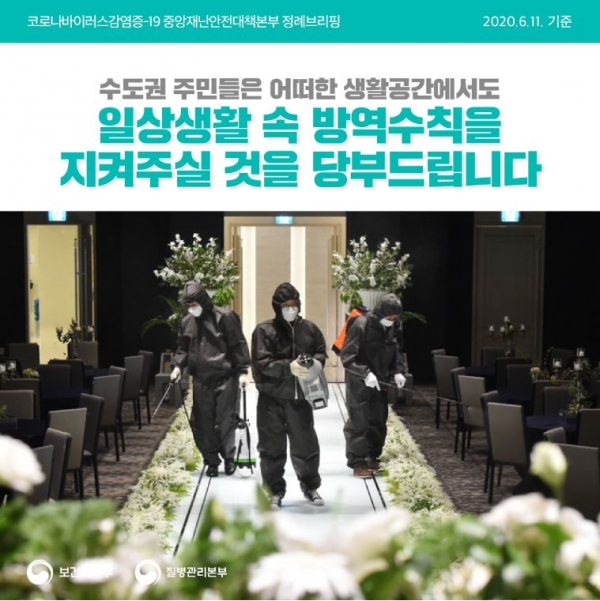 중앙재난안전대책본부 브리핑에 의하면 수도권의 감염 위험도는 계속 증가하는 추세이며 종교 소모임, 방문 판매 업체, 탁구장 등에서 시작된 집단감염이 지역사회로 확산되는 양상을 보인다고 밝혔다.