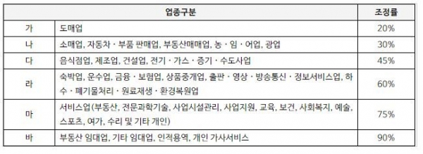 예를 들면 연 매출 5000만 원인 음식업주는 조정률 45% 반영으로 사업소득이 2250만 원이 돼 근로장려금 지급 대상에서 제외된다. 반면 동일 매출의 도매 자영업자는 업종별 조정률 90%를 적용해 사업소득이 1000만 원이 되어 근로장려금을 받을 수 있다.