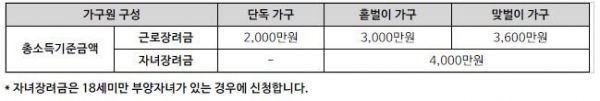 단독 가구는 150만원 기준으로, 홑벌이 가구는 260만원 기준으로, 맞벌이 가구는 300만원 기준으로 소득에 따른 변동한다.