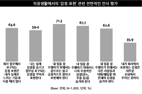 또한 대다수 직장인이 자신의 일을 잘 수행하기 위해서는 겉으로는 밝고 긍정적으로 말하고 표현해야 하고(71.3%), 부정적인 감정을 숨겨야 하며(67.7%), 다른 사람들과 대화를 하거나, 행동을 할 때는 본래의 감정을 숨겨야 한다(62.6%)는 것을 당연하게 받아들이는 모습으로, 상대적으로 여성과 3·40대 직장인들이 보다 일상적으로 직장생활에서 감정노동을 하고 있는 것으로 보여졌다.