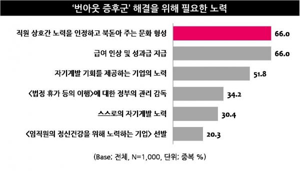 '번아웃 증후군' 문제를 해결하기 위해서는 직원 서로간의 노력을 인정하고, 힘을 북돋아 주는 문화를 형성하고(66%, 중복응답), 급여 인상 및 성과급의 지급이 이뤄져야 한다(66%)고 주장하는 직장인들이 많았다. 상호 존중의 직장문화를 만들어가는 한편, 일에 대한 적절하고 충분한 보상을 제공해야 직장생활에서 육체적·정신적 피로감을 덜 느끼고, 일할 의욕은 커질 것이라고 바라보는 것이다.