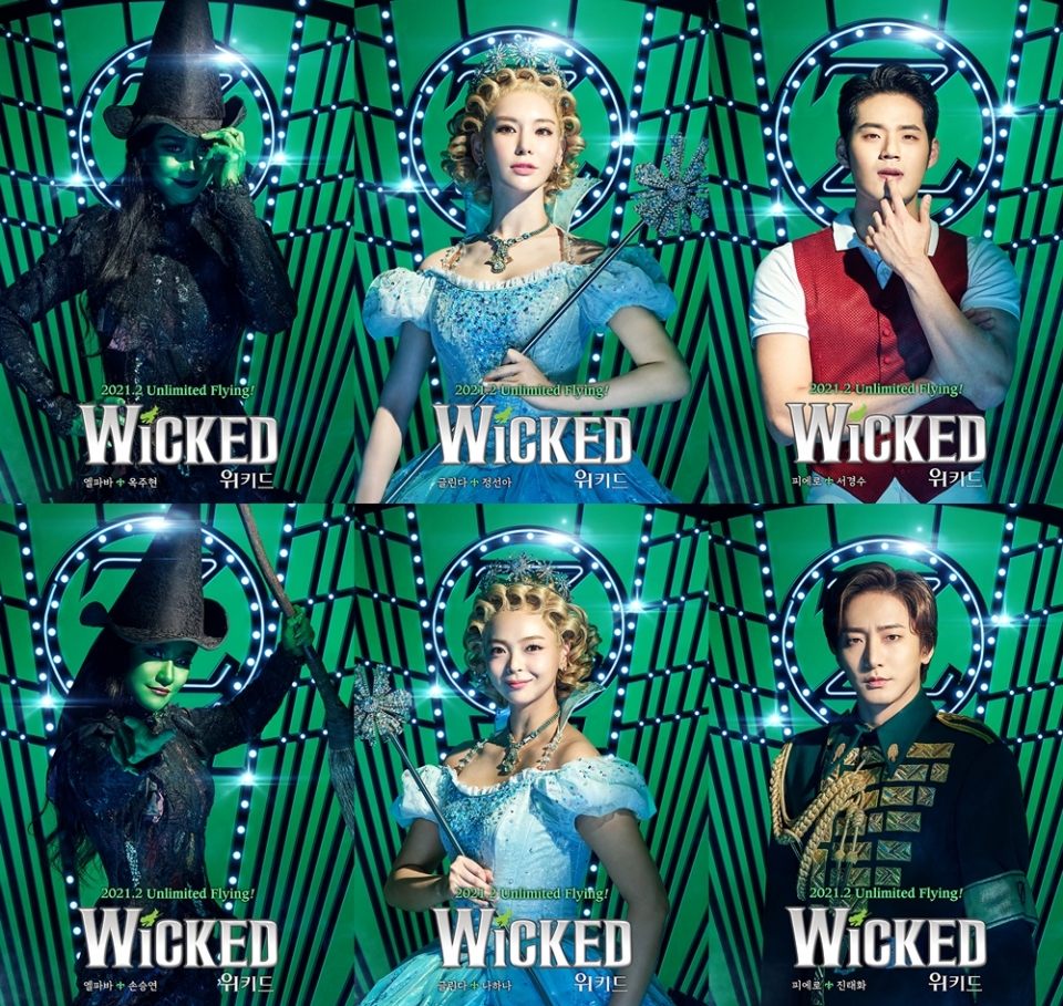 수많은 타이틀 롤에 자신의 이름을 각인시켜온 옥주현이지만 '위키드'는 더욱 특별하다. 엘파바라는 복합적인 캐릭터를 섬세하고 디테일한 연기로 표현해 ‘엘파바에 자신을 투사한 것 같다’라는 극찬을 받은 그녀는 '위키드'에 다시 돌아오는데 이렇게 오랜 시간이 걸릴 줄 몰랐다며 마치 어제 벗었던 엘파바의 옷을 다시 입은 것처럼 설렘을 감추지 못했다. 신비로운 미소를 띤 초록 마녀가 된 캐릭터 포스터는 왜 그녀를 가리켜 초록 분장만 안 한 엘파바라고 하는지 보여준다. 한국 뮤지컬을 대표하는 디바 정선아는 한국 전 시즌에 출연했으며 글린다 최다 공연이라는 쉽게 깨질 수 없는 기록을 세운 주인공. 한국의 오리지널 글린다라고 불릴 정도로 철없는 귀족 소녀에서부터 오즈를 이끌어 가는 마녀로서의 드라마를 완벽하게 소화한 정선아는 마지막 무대 그 순간부터 그리웠다고 할 정도로 '위키드'는 애정을 가진 작품. 글린다로 1년 만에 무대에 서게 될 그녀는 우아하면서도 당당한 글린다를 캐릭터 포스터에 담아냈다.