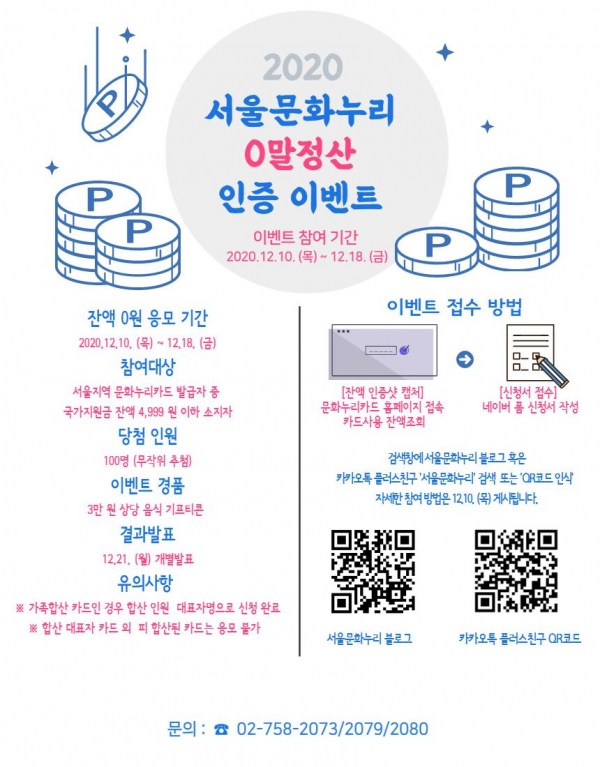 [문화뉴스 이수현 기자] 서울문화재단(대표이사 김종휘)은 문화예술, 체육, 국내관광 분야에서 문화활동을 할 수 있도록 지원하는 ‘문화누리카드’의 잔액 인증 이벤트 '0말정산'을 오는 10일(목)부터 18일(금)까지 진행한다.