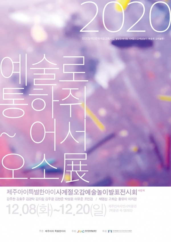 [문화뉴스 이수현 기자] 제주특별자치도 민속자연사박물관(관장 노정래)은 8일부터 오는 20일까지 ‘박물관 속 갤러리’ 아홉 번째 초청 전시로 발달장애아동의 사계절오감예술놀이 발표 전시회 ‘예술로 통하쥐 어서 오소 展’을 개최한다고 밝혔다.