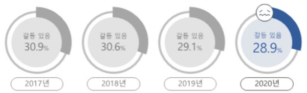 최근 1년동안 가정, 직장 또는 주변사람들과 갈등 경험 정도는 서울시민 10명 중 3명 정도(28.9%)가 ‘갈등을 경험했다’고 답했으나, 감소추세에 있다.(’17년 30.9%→’18년 30.6%→’19년 29.1%→’20년 28.9%)