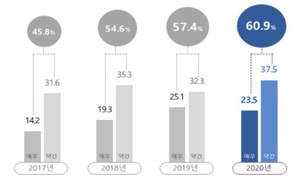 ‘충분한 대책 마련 후 추진해야 한다’ 응답률이 꾸준히 증가하고 있다. (’17년 64.4%→’18년 66.3%→’19년 68.3%→’20년 73.2%)