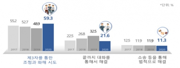 ‘제3자를 통해 조정과 화해 시도’에 대한 응답률이 하락세를 보이다 올해 다시 증가(’17년 55.2%→’18년 52.7%→’19년 48.9%→’20년 59.3%)한 반면, 상승세를 보이던 ‘끝까지 대화를 통한 해결’ 응답률이 하락하였다.(’17년 22.5%→’18년 26.8%→’19년 32.5%→’20년 21.6%)