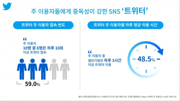 트위터 주 이용자의 약 59%는 하루에 10회가량 트위터에 접속한다고 밝혔으며, 48.5%는 하루에 3시간 이상 트위터를 사용한다고 답했다.