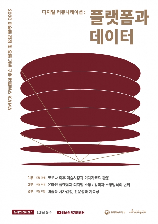 [문화뉴스 정혜민 기자] 문화체육관광부(장관 박양우)와 (재)예술경영지원센터(대표 김도일)가 온라인 플랫폼이 부상하며 발생하는 미술품 유통, 커뮤니케이션, 시가감정의 변화를 논의하는 ‘2020 미술품 감정 및 유통 기반 구축 컨퍼런스(2020 KAMA: KAMS Art Market & Appraisal conference)’를 오는 29일(화)부터 온라인으로 개최한다.