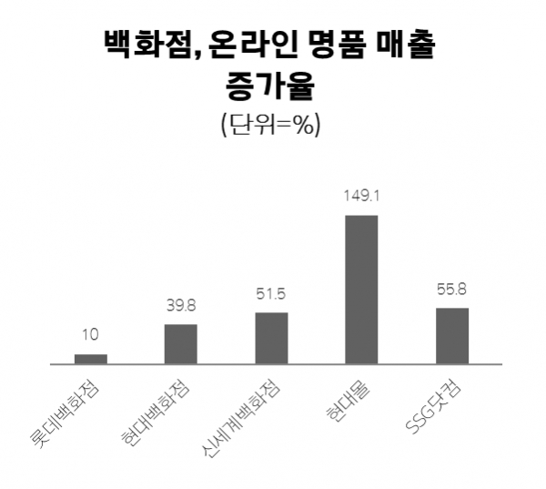 산업통상자원부에 따르면, 백화점 명품 브랜드 매출은 코로나 1차 대유행이 있던 지난 3월 제외하고 매달 지난해 같은 기간보다 플러스(+) 성장을 했다. 5월엔 19.1%, 6월 22.1%, 7월 32.5%, 8월 27.6%, 9월 15.3%, 10월 23.8%, 11월 17.9%씩 매출이 늘었다.