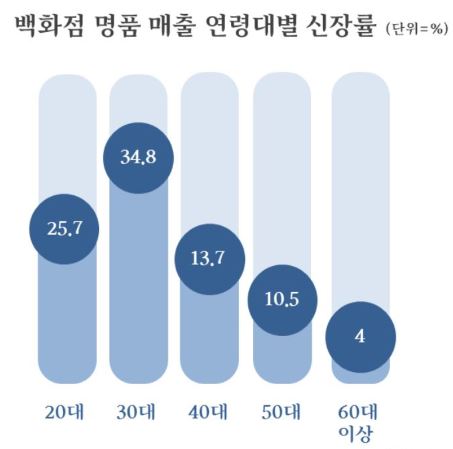 롯데백화점에 따르면 올 상반기 20대 이하와 30대의 명품 매출 신장률은 각각 25.7%, 34.8%로 같은 기간 40대(13.7%), 50대(10.5%) 대비 크게 늘었다고 밝혔다. 신세계백화점에서도 2030세대의 명품 매출 신장률이 30.1%로 작년보다 10% 포인트 가량 증가했다.