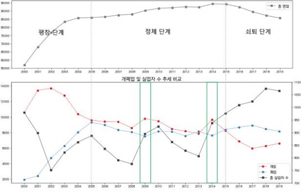연구원은 지난 20년간의 치킨집 개폐업 데이터를 토대로, 2000년 초반 이후 급증한 치킨집이 2010년대 중반 개폐업 수가 비슷해지더니 현재는 폐업이 개업보다 많은 쇠퇴 단계에 있다는 분석 결과를 밝혔다. 결과에 따르면 2000년대 초반은 치킨집의 수가 급증하는 팽창단계, 2000년대 중반에서 2010년대 중반까지는 개폐업의 수가 비슷한 정체단계, 2010년대 후반부터는 폐업의 수가 개업을 역전하는 쇠퇴단계로 분류된다.
