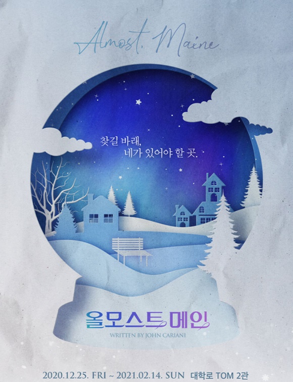 연극 '올모스트메인(Almost, Maine)'은 2004년 미국 메인 주 포틀랜드에서 초연했다. 초연부터 현재까지 미국에서만 2500개가 넘는 프로덕션에서 공연된 이 작품은 이미 20개 이상의 언어로 번역되어 전 세계 관객들의 마음을 사로잡고 있는 따뜻한 작품이다. '올모스트메인'은 2000년대 후반부터 국내 여러 극단이 다양한 형식으로 선보여 왔으며 극단 차이무가 번안한 '그 때, 별이 쏟아지다'와 원작을 올렸고, 공연배달서비스 간다도 원작대로 공연한 국내 관객들과의 소통을 이어오고 있다.