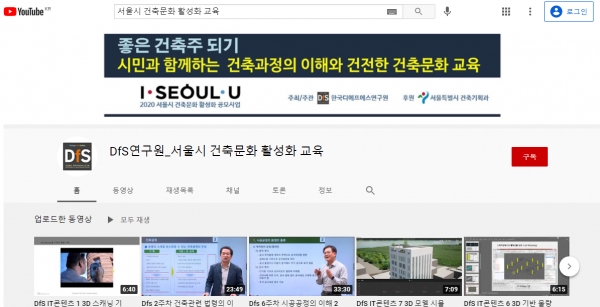 서울시는 건축문화 활성화 공모사업으로 '시민과 함께하는 건축 문화교육'을 제안한 한국디에프에스연구원의 '좋은 건축주 되기' 교육을 후원하고, 강의 영상을 유튜브에 게재하였다.
