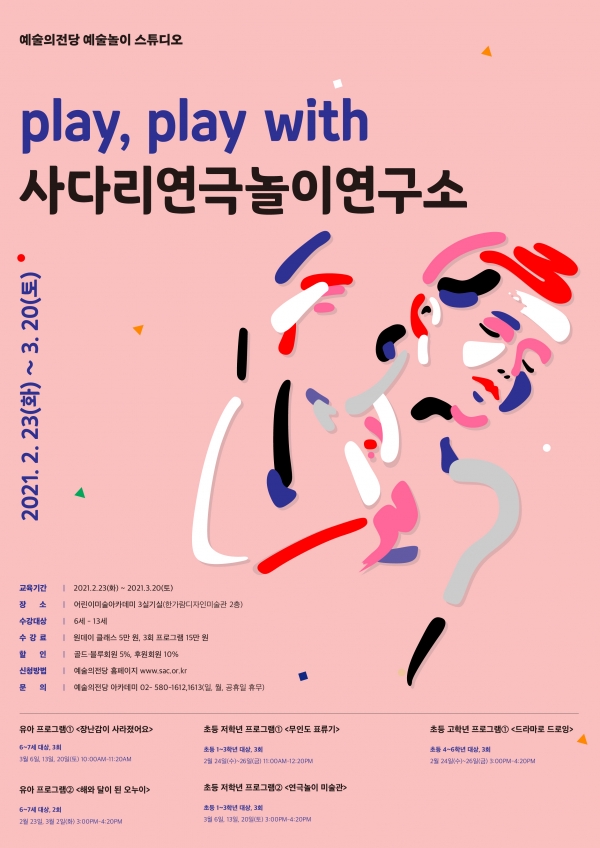 또한, 예술의전당(사장 유인택) 아카데미는 ‘사다리연극놀이연구소’와 협업 프로그램으로 예술의전당 예술놀이 스튜디오 'play, play with 사다리연극놀이연구소'를 기획했다.