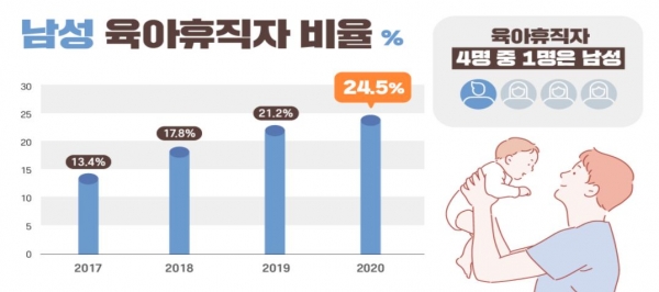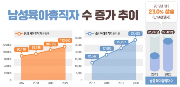 [ 문화뉴스 임건탁 기자] 고용노동부가 20년 남성 육아휴직자의 수와 비율이 19년에 비해 크게 증가했다고 밝혔다.