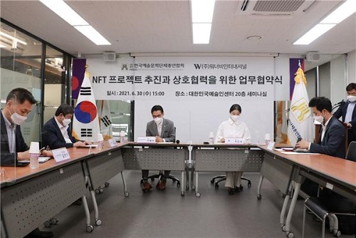 한국 예술 문화의 창달과 국제 교류 및 예술 문화 발전에 기여하고, 예술인의 권익 신장을 목표로 하는 한국예술문화단체총연합회(이하 한국예총)와 글로벌 마케팅 전문기업 ㈜워너비인터내셔널의 NFT 통합서비스 플랫폼 ‘NvirWorld(엔버월드)’가 30일 NFT 블록체인 기반의 예술 문화 진흥 및 발전을 위한 상호 업무협약(MOU)을 체결했다.