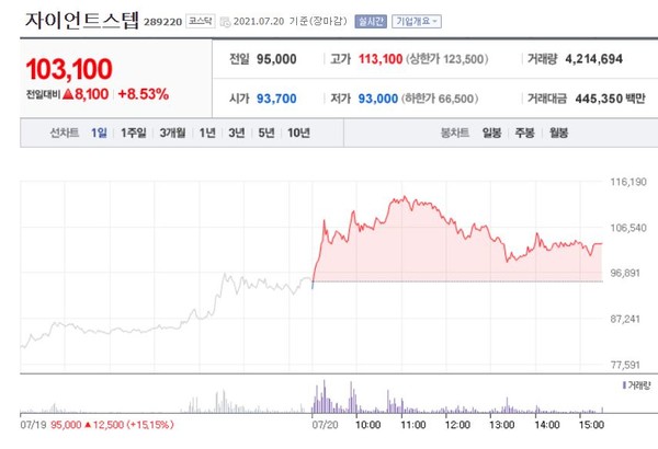 주가는 장중 신고가인 11만3100원을 터치하고 하락해 전일대비 8.53%(8,100원) 상승한 103,100원에 장을 마쳤다.