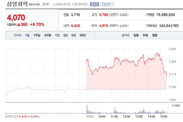 삼영화학은 장중 상한가 목전인 4760원까지 치솟았으나 3시께 하락해 전일대비 9.70%(360원) 하락한 4,070원에 장을 마쳤다.