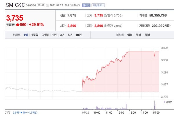 SM C&C는 오후1시께 가격제한폭까지 치솟으며 전일대비 29.91%(860원)에 장을 마감했다.