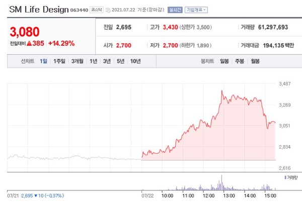 SM계열사 SM Life Design(이하 SM라이프디자인그룹)에도 매수세가 쏟아졌다.