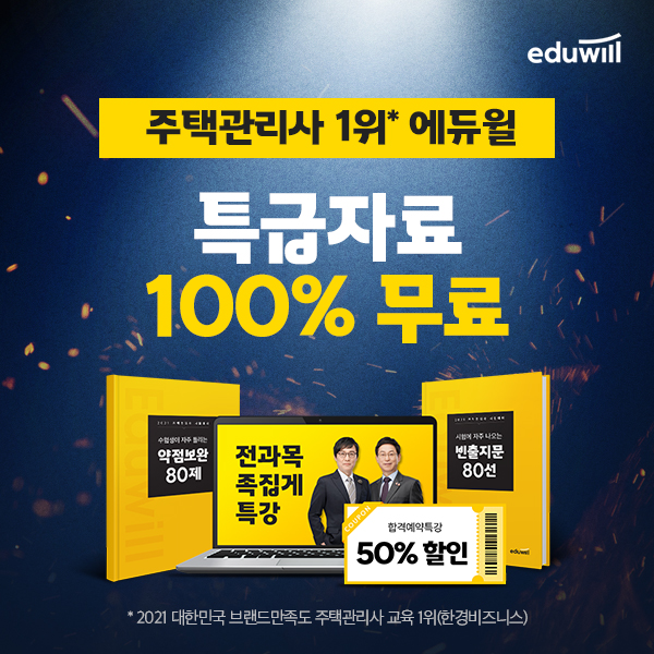 에듀윌 주택관리사가 무료로 제공하는 특급자료는 최다 합격자를 만든 교수진(관계법규 윤동섭, 관리실무 김영곤)의 ‘2차 족집게특강’과 5개년 시험 핵심지문만을 엄선한 ‘빈출지문 80선’ 등을 모두 무료로 제공한다.