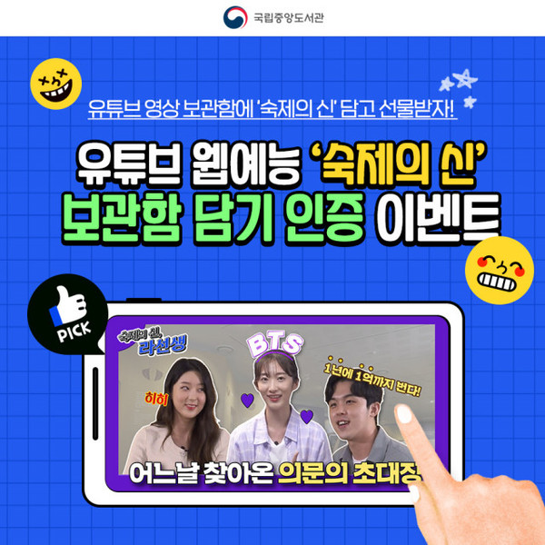 [문화뉴스 백현석 기자] 국립중앙도서관은 웹예능 시리즈 ‘숙제의 신, 라선생’을 공식 유튜브 채널에 공개하고, 영상 보관함 담기 인증 이벤트를 진행한다.
