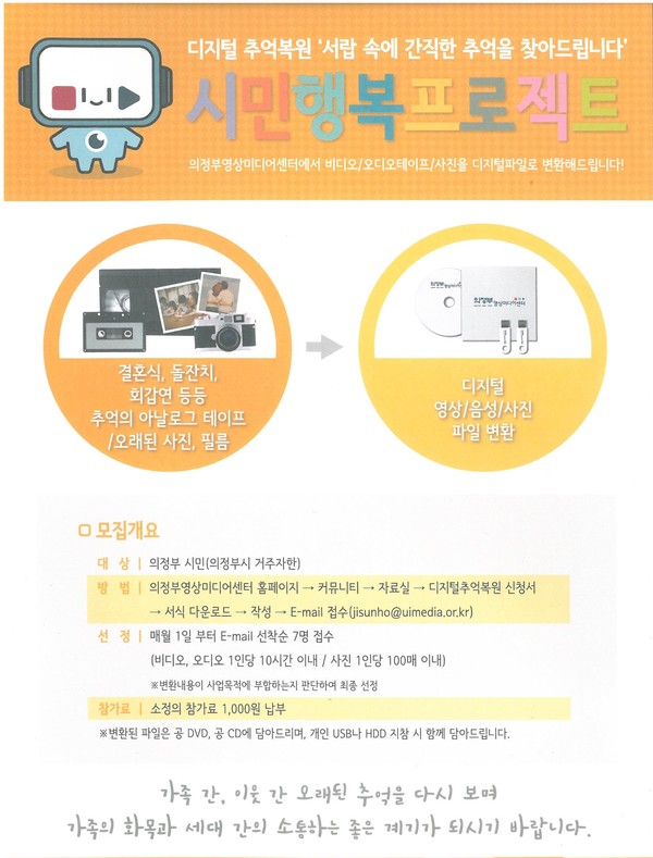 이에 시민들이 추억을 되새기며 영상물을 수시로 관람 할 수 있도록 테이프를 디지털 파일로 변환해 주는 서비스 이다. 특히 옛날 사진을 두꺼운 양장 앨범에 보관만 하여 꺼내 보기도 힘들고 빛이 바라고 훼손되어 사실상 가정에 큰 짐이 되어 방치하고 있는 게 현실이다. 이러한 옛날 사진들과 필름을 디지털 파일로 변환 해주는 서비스도 2023년부터 실시한다.