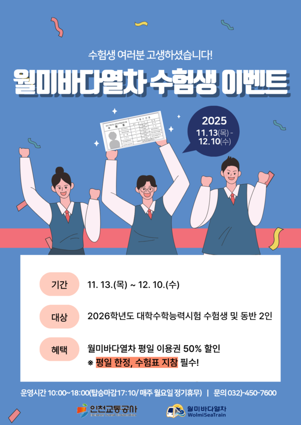 문화뉴스 김인환 기자 = 인천교통공사(사장 최정규)가 2026학년도 대학수학능력시험을 마친 수험생들을 위해 특별한 혜택을 마련했다. 공사는 오는 11월 13일부터 12월 10일까지 ‘월미바다열차 수험생 특별 할인 이벤트’를 실시한다고 10일 밝혔다.