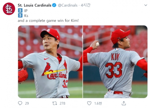 세인트루이스 공식 트위터는 17일(한국시간) "5이닝, 5탈삼진, 김광현의 완벽투"라고 감탄하는 글과 함께 김광현이 등 번호 33번을 달고 역투하는 사진 2장을 게재했다.