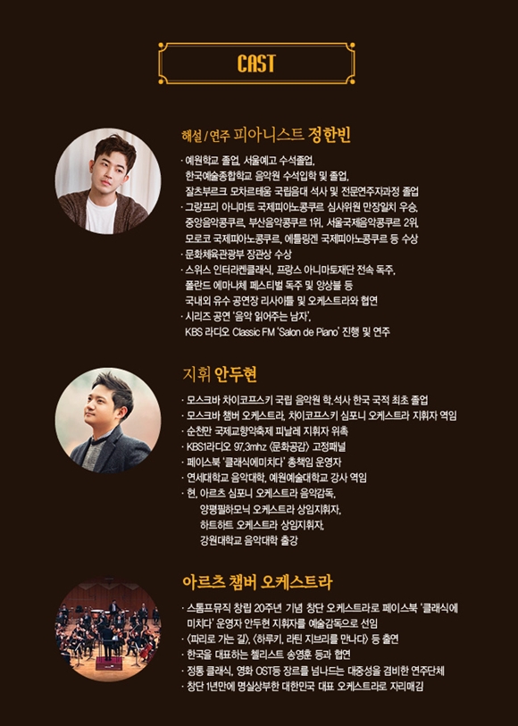 본 공연은 클래식 계의 라이징 스타로 주목받는 피아니스트 정한빈이 연주와 해설을 맡아 관객들을 새로운 음악의 세계로 안내한다.