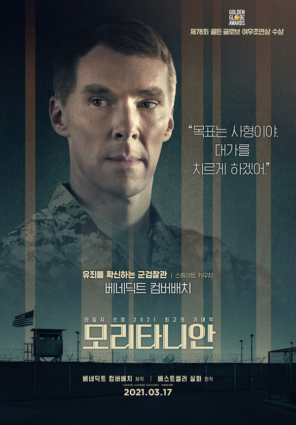 공개된 캐릭터 포스터에서 베네딕트 컴버배치는 유죄를 확신하는 군검찰관 ‘스튜어트 카우치’로 분해 냉철한 카리스마를 발산하고 있다. “목표는 사형이야. 대가를 치르게 하겠어”라는 카피를 통해 9.11 테러의 주동자로 지목된 ‘슬라히’(타하르 라힘)의 죗값을 묻기 위해 사력을 다할 것을 예고해 긴장감을 자아낸다.