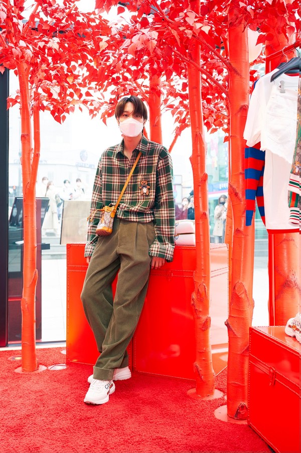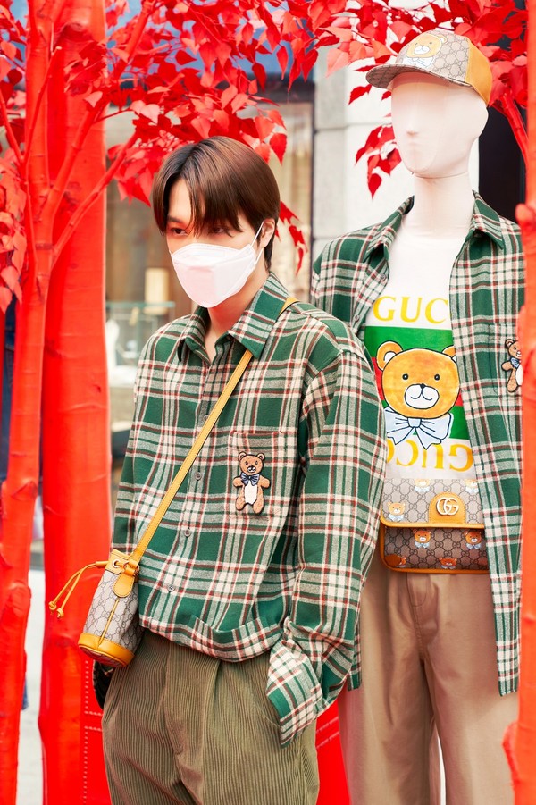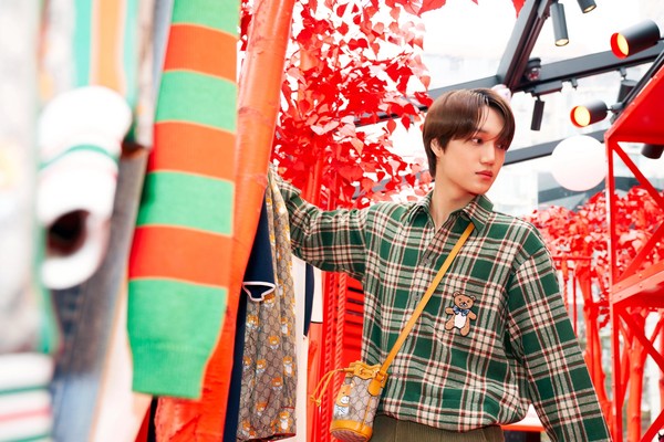 카이는 블루 컬러의 보우 디테일이 돋보이는 테디 베어 장식의 그린 체크 셔츠를 입고, 테디 베어 프린트의 미니 버킷 백과 롸이톤 스니커즈 등 카이x구찌(KAIxGucci) 컬렉션을 매치해 편안하면서도 스타일리시한 룩을 선보였다.