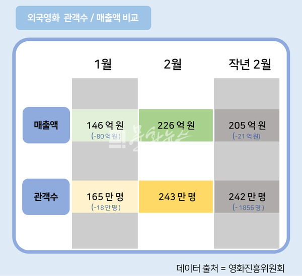반면 외국 영화의 관객수는 1월에 비해 늘었을 뿐만 아니라(47.7%, 78만 명 ↑), 작년 2월에 비해서도 소폭(0.1%, 1,896명 ↑) 증가했다. 매출액도 전월과 전년 2월에 비해 증가한 226억 원이다.