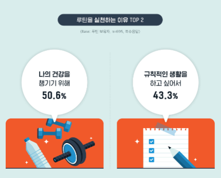 응답자의 77.2%가 매일 실천하려고 노력하는 루틴이 있다고 응답했으며, 인당 평균 2.2개의 루틴을 실천하고 있었다. 루틴을 실천하는 이유로 ‘건강해지기 위해(50.6%)’가 가장 응답이 많았고, 이어서 ‘규칙적인 생활을 하고 싶어서(43.3%)’ 순으로 나타났다.