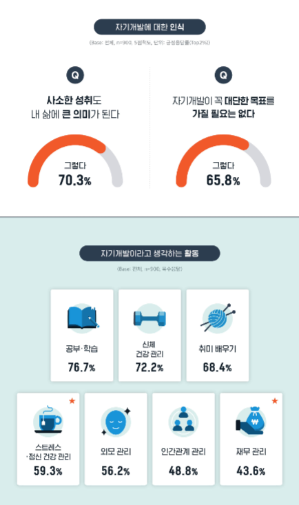 자기개발이 가지는 의미도 가벼워졌다. 응답자의 65.8%가 ‘자기개발이 꼭 대단한 목표를 가질 필요는 없다’고 생각했다. 또 ‘사소한 성취도 내 삶에 큰 의미가 된다(70.3%)’는 응답 비율도 높았다.