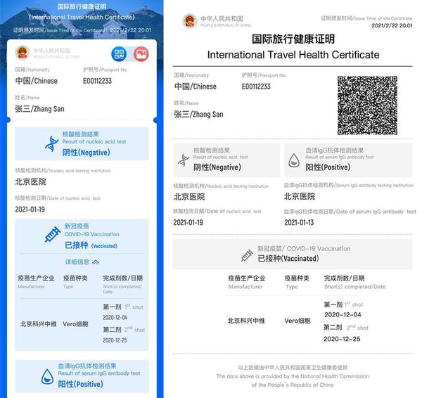 중국 외교부는 지난 3월 9일 중국판 백신여권 '국제여행건강증명'을 중국 메신저 '위챗'과 연결된 미니 프로그램으로 3월 8일 공식 출시했다고 밝혔다. 증명서는 코로나 19 백신 접종 이력과 핵산검사 결과, 혈청 항체형성 유무와 접종 종류 및 날짜 등 주요 정보가 암호화된 QR 코드로 제공되며, 종이로도 출력 가능하다. 이어 중국 정부는 자국의 신종 코로나바이러스 감염증 백신을 접종한 뒤 홍콩을 통해 입국하는 외국인에게 비자 발급 절차를 간소화하겠다고 밝히기도 했다.