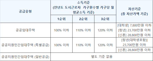 입주 대상은 만 19~39세 대학생, 청년, 신혼부부로 차량 미운행자 및 미소유자이다. 소득 및 자산기준은 아래와 같다.