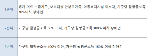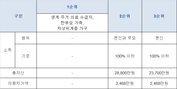 임대 대상은 대학생과 취업준비생이다. 신청순위는 아래와 같다. 이때 월평균소득 이하 가구의 경우 총자산 17,800만원, 자동차 2,545만원 이하 조건도 충족해야 한다. 1,2 순위의 경우 일반형에 지원 가능하며 1,2,3 순위의 경우 쉐어형에 지원가능하다.