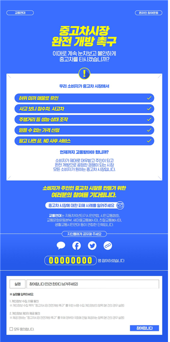 자동차시민연합 임기상 대표는 “중고차 시장 개방 관련 논의는 최종 결론을 내지 못한 채 시간만 흐르고 있다”라며, “정부의 결론을 무한정 기다리기보다 중고차뿐 아니라 신차까지 자동차 시장의 모든 소비자가 자신들의 권익을 위해 직접 적극적으로 나서야 할 때가 왔다”라고 온라인 참여운동의 의미를 설명했다.