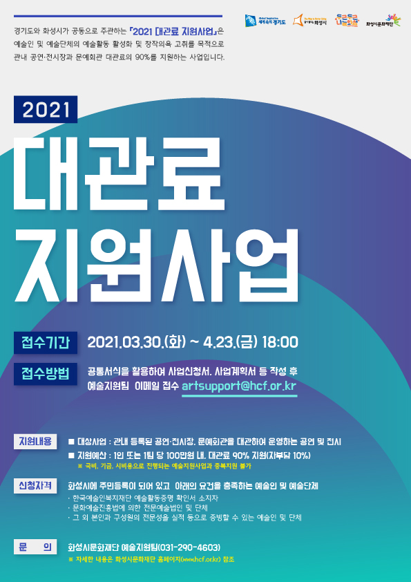 [문화뉴스 조희신 기자] 화성시문화재단(대표이사 이종원)이 경기도와 화성시가 공동으로 주관하는 ‘2021 대관료 지원사업’에 참여할 예술인과 예술 단체를 모집한다.