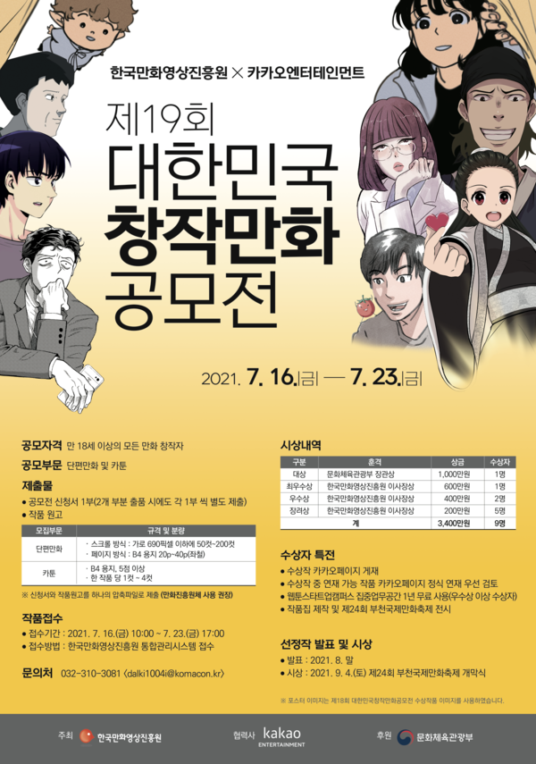 올해로 19회를 맞는 대한민국창작만화공모전은 만 18세 이상의 만화 창작자라면 누구나 참여할 수 있고, 자유 주제로 단편만화 부문과 카툰 부문의 응모작을 모집한다. 작품 접수 기간은 7월 16일부터 7월 23일까지이다. 자세한 모집요강과 작품접수는 한국만화영상진흥원 통합사업관리시스템을 통해 확인할 수 있다.